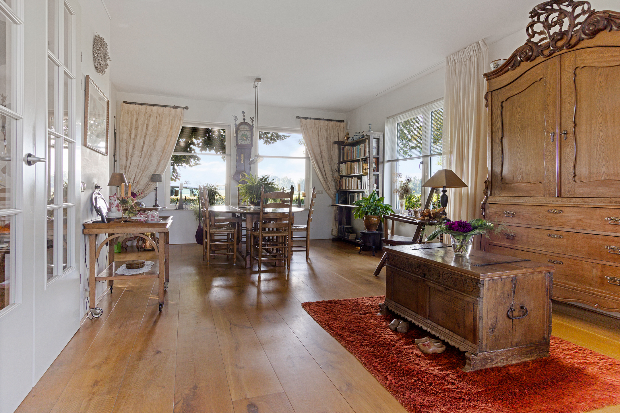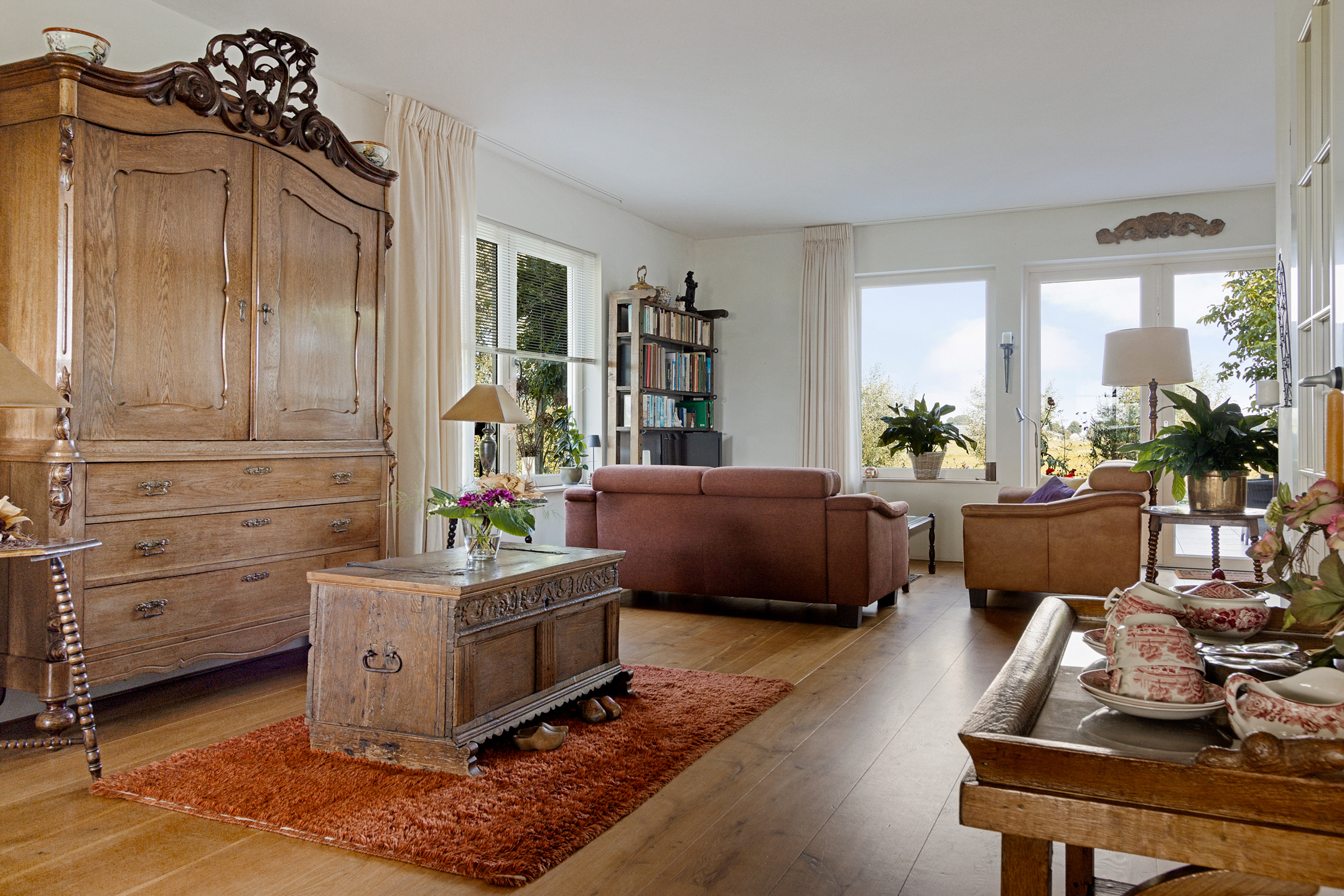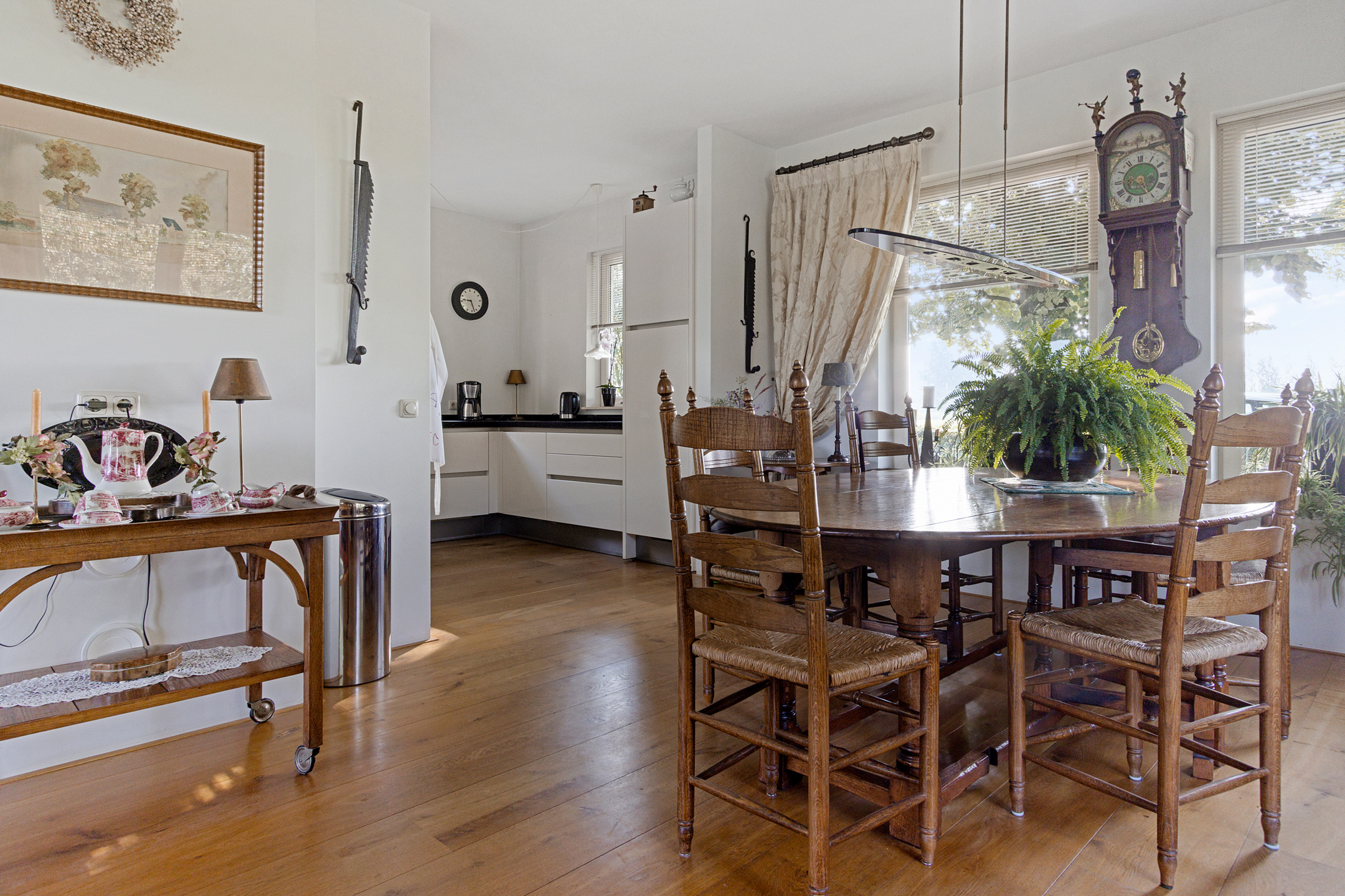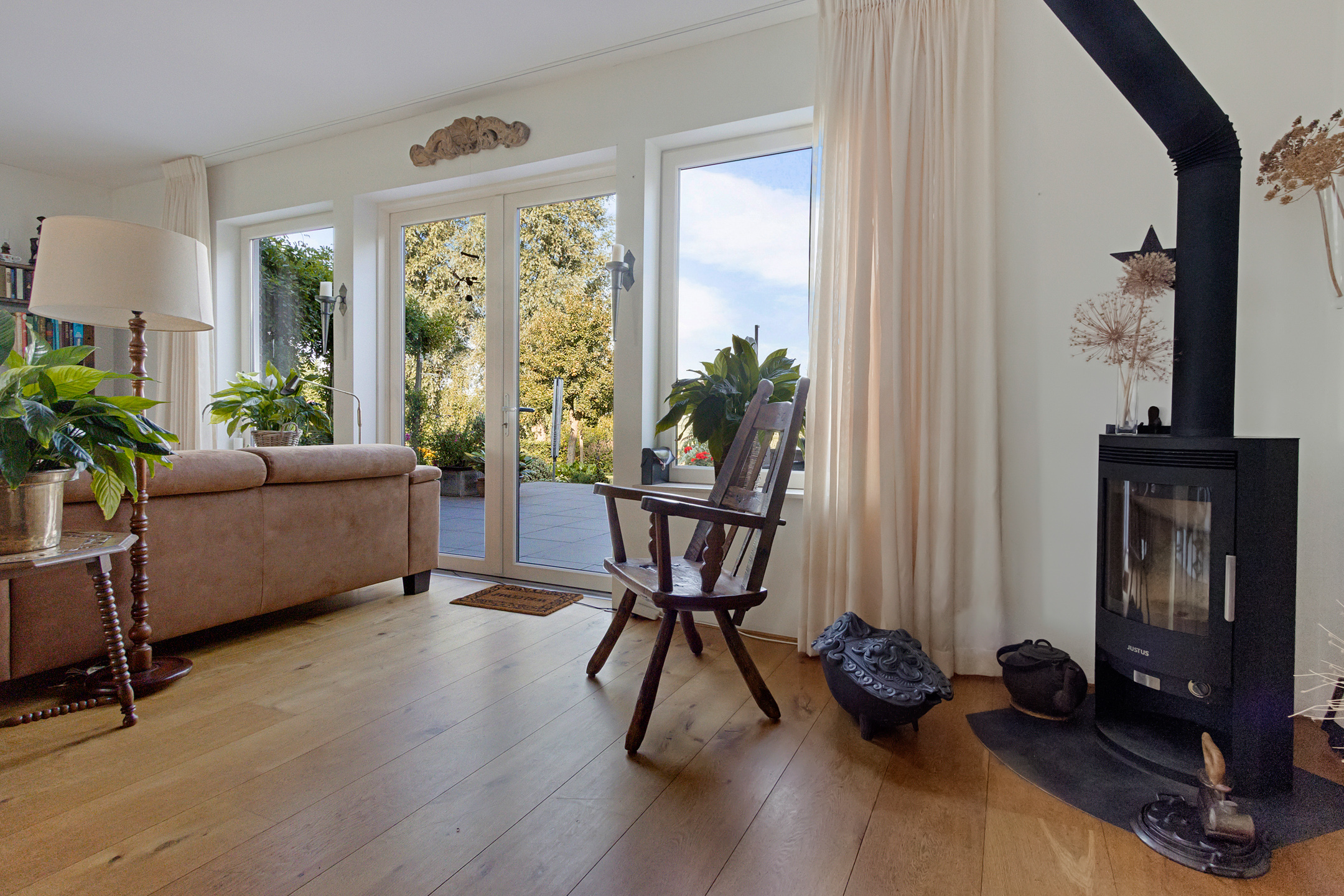 De woning (bouwjaar 2006) is degelijk gebouwd, uitstekend geïsoleerd en voorzien van 12 zonnepanelen. De lichte woonkamer van ca. 58 m² heeft grote ramen aan drie zijden en dubbele tuindeuren richting het terras. Vanuit elke hoek kijkt u weg over het groen — een uitzicht dat nooit verveelt. De houten vloer, de warme kleuren en de royale indeling zorgen voor een prettige sfeer waarin ruimte en gezelligheid perfect samengaan.