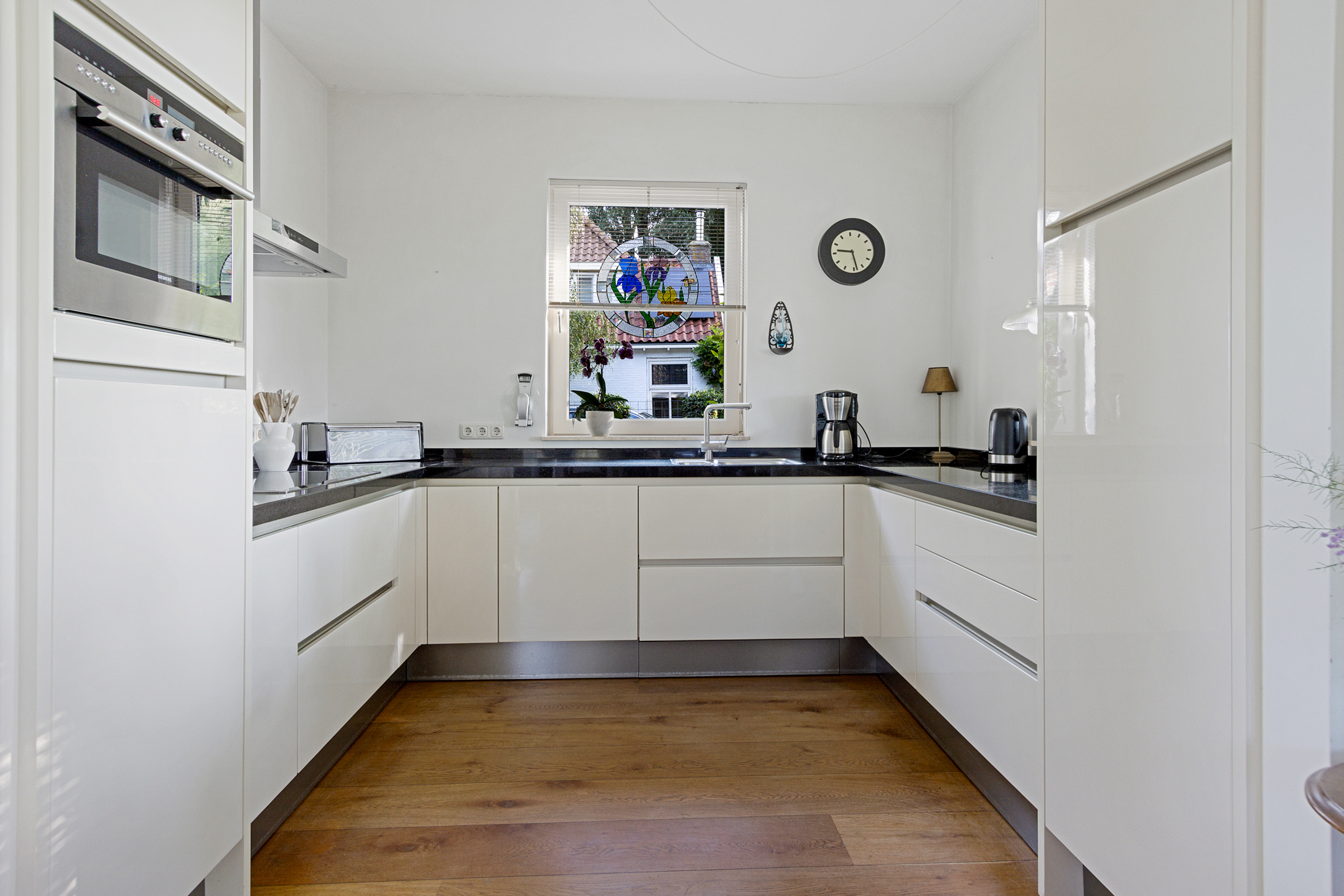 De keuken (9,2 m²) ligt aan de voorzijde en is modern uitgevoerd in een lichte hoekopstelling met inbouwapparatuur: inductiekookplaat, afzuigkap, combi-oven, vaatwasser, koelkast en vrieskast. Terwijl u kookt, kijkt u uit over de landelijke omgeving — koken met uitzicht!