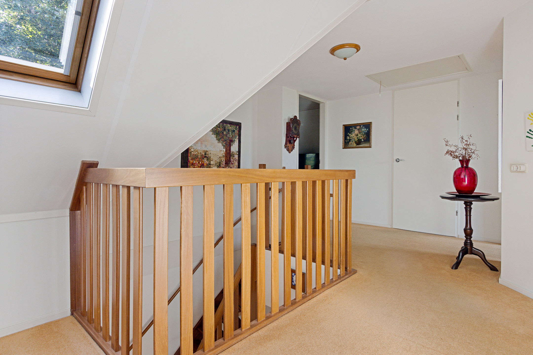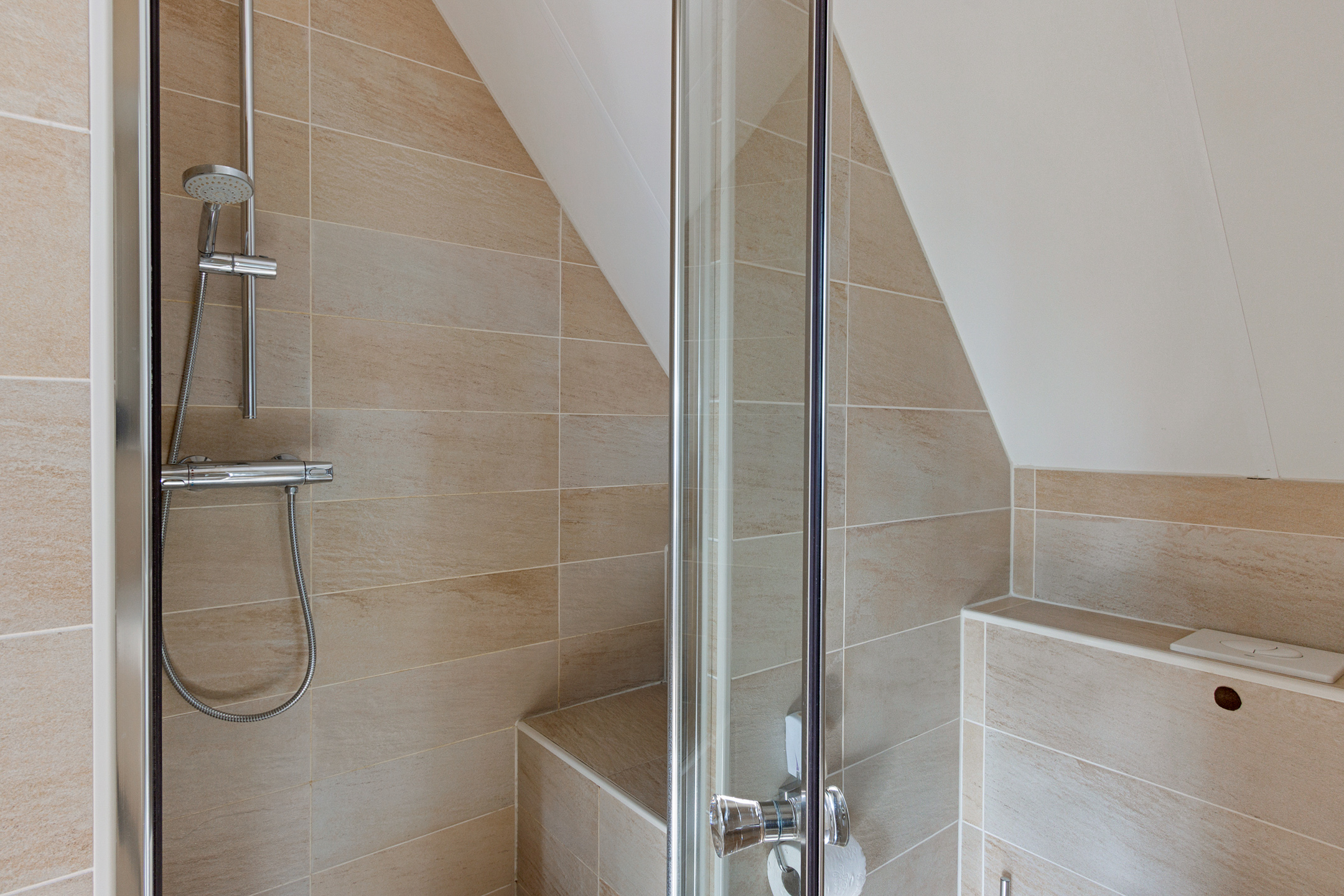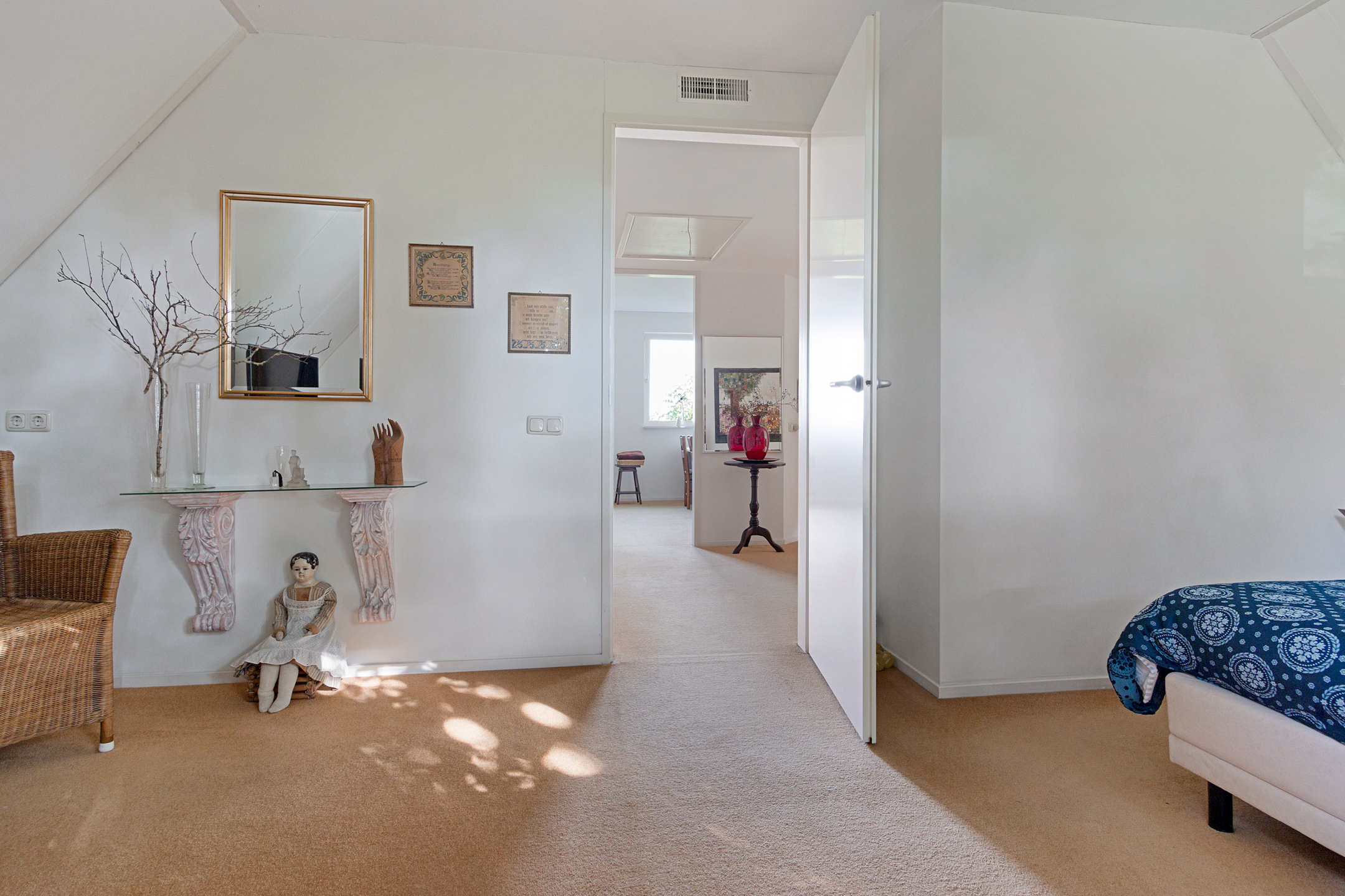 Op de eerste verdieping vindt u drie ruime slaapkamers van ca. 20, 17 en 16 m². Eén kamer beschikt over een eigen badkamer met douche, toilet en wastafel. Daarnaast is er een tweede, complete badkamer met inloopdouche, toilet en dubbele wastafel. Verder is er nog een handige berging en een vliering met extra opbergruimte.